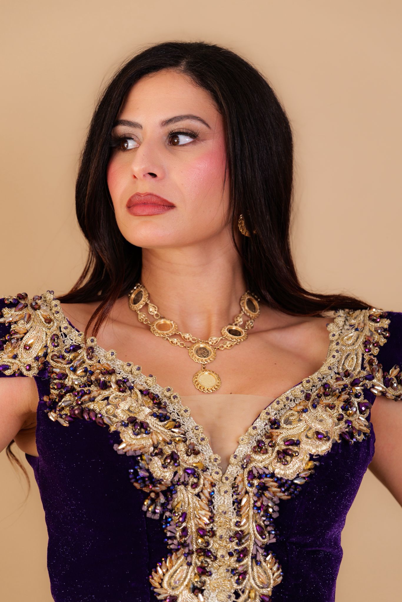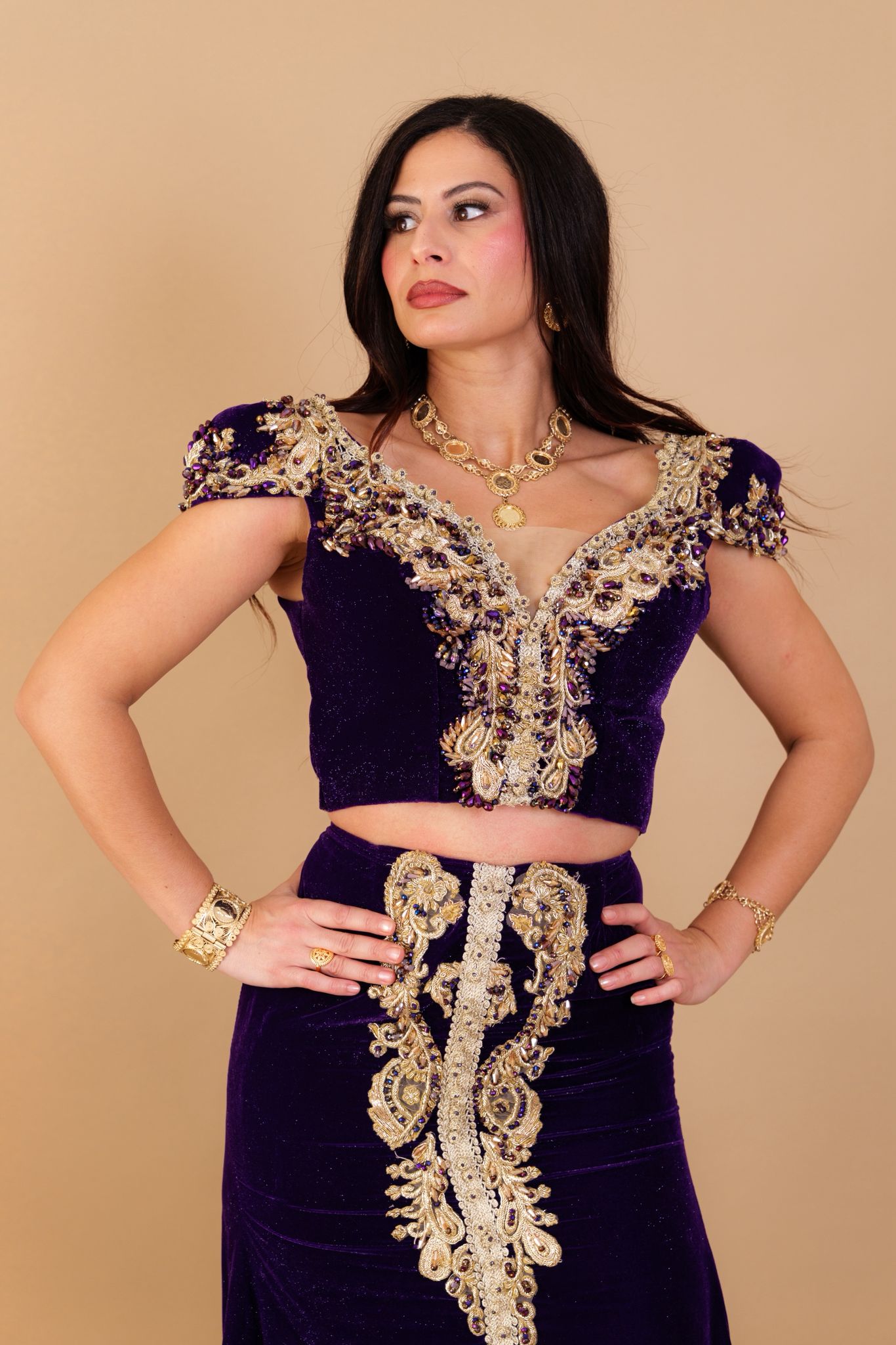 - Tebdila : Un tissu velours de haute qualité, brodé avec des motifs Adas, reflétant l’artisanat tunisien. Ornée de cannetille, ajoute une touche d’élégance et de sophistication à l’ensemble.